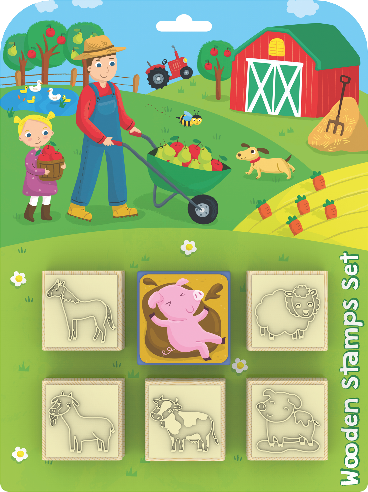 Balení obsahuje 5 snadno uchopitelných dřevěných razítek a barevnou podušku s oblíbeným motivem.